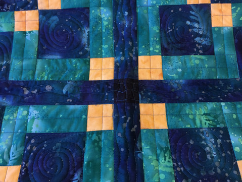 As I brought them over to my sewing machine I saw the quilt lying on my long arm quilting machine. The quilt was a simple design, called a disappearing 9 patch that I had assembled last year and never quilted. I decided I would put it on the frame so I could work on it later. I found threads for the top and bottom that I really liked so I threaded the machine. After staring at the quilt for a few minutes inspiration struck and I started to quilt it. I was really enjoying the design I had worked out in those few minutes and before you know it I was half way done so I figured, what the heck, I might as well finish it! So I did! And in record time, just under 3 hours. Usually it takes me days to figure out what to quilt let alone actually finish it.